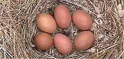 A Barnevelder hen lays some 175–200 brown eggs per year, with a weight of about 60–65 g.[1]: 12