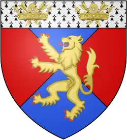 ![]() ![]() Per saltire gules and azure, a lion rampant or; on a chief ermine, two ducal coronets each enfiling as many arrows in saltire of the third | |
