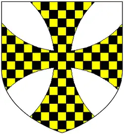 Arms of Lawley: Argent, a cross formée extended to the extremes of the shield chequy or and sable[1]