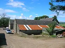 The ancient mansion or castle[3] of Kersland stood on Easter (now 'East') Kersland Farm. The remains of the 'L-Plan' tower has been built into the farmhouse. The barmkin wall survives and has a surviving strong defensive corner tower.[4] Paterson records that the house was almost entirely pulled down by the feuar, Robert Ker.[5] The remaining two barrel vaulted chambers, later used as a dairy and stable, with walls 8 ft thick, until recently formed part of the offices attached to East Kersland.