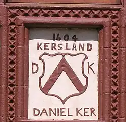 Over the main entrance door of the dwelling house is a carved stone removed from the old manor house bearing the arms of the Ker family, with an inscription "Daniel Ker Kersland - 1604". This date stone has been touched-up with paint.[6] Karrisland (sic) is recorded on Timothy Pont's map c. 1604, as are the placenames Karshead, Todsle, Dysil, and Achingry.[7] In 1685 'Carsland' is shown.[8] The property had been surrounded by trees and had an orchard of considerable extent.[9] Kersland Mains was on the entrance lane from Dalry and became Wester Kersland Farm when the manor house/castle was demolished.
