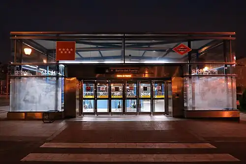 Barrio del Puerto [ˈbarjo ðel ˈpweɾto] is a station on Line 7 of the Madrid Metro, named for the Barrio del Puerto ("Barrio of the Gate") neighbourhood. It is located in fare Zone B1.[1]