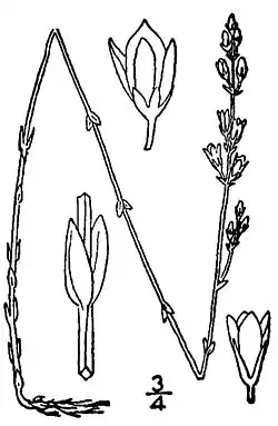 Bartonia virginica is an annual plant,[3] that typically has simple stems that are wiry and erect. The stems are 1–4 dm tall, with opposite, strongly ascending branches. The leaves are scale-like usually opposite. The flowers are arranging in racemose or paniculate inflorescence, which have commonly opposite, very upright branches and pedicels. Each flower is 3–4 mm long with lance-subulate shaped sepals. The petals are oblong in shape and usually have denticulate margins and are abruptly narrowed to a rounded or obtuse, often mucronate tip. The anthers are minutely apiculate. It flowers late summer. The diploid (2n) chromosome count is fifty-two.[4][5]