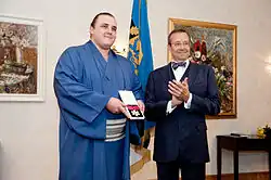 Baruto's promotion was officially confirmed by the Sumo Association on March 31. Speaking to reporters at his Onoe stable, he said, "I want to be cheerful and be an ōzeki that can live up to the expectations of the fans." He also made clear his determination to win the yūshō, as "unless I win a championship I can't move up to yokozuna."[9] However, for a significant period he was not able to challenge for the championship as an ōzeki, his best score never being higher than 11–4. This changed in January 2012, when after he recorded 13 straight wins and his nearest challenger yokozuna Hakuhō suffered three losses in four bouts, he took the championship with two days left to spare.[14] This made him the ninth foreigner, and the second from Europe after Kotoōshū, to win a top division championship.[14] He finished on 14–1, denied a perfect record by Hakuhō on the final day.[15] He was told he had to win the next tournament or be in contention until the final day to earn a shot at yokozuna promotion, but Baruto told reporters the day after celebrating his victory, "If I can wrestle at the spring basho like I did at the New Year meet, results will follow. Once you win one tournament, you want to win a second, a third, a 10th and a 30th."[16] At the Osaka tournament in March he stood at 9–1 after ten days, but lost four of his last five matches to finish on a disappointing 10–5, putting any hopes for yokozuna promotion back to square one. Baruto had been suffering from a fever during the tournament and said afterwards that talk of yokozuna was just "journalistic chatter ... that wasn't my goal in this tournament."[17]