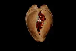 A shell of Barycypraea teulerei, ventral view, anterior end towards the left