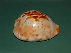 A shell of Barycypraea teulerei, lateral view, anterior end towards the right