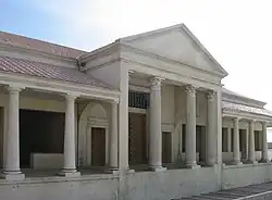 This simple single-storey building consists of a main building with five bays covered with Roman tiles and a pavilion with projections from the same material.[31]