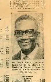 Basil Lewis OBE (1927-2020) was a British community leader, politician and businessman. He was the first black councillor elected in the London Borough of Haringey and one of the first black councillors elected anywhere in the United Kingdom.[2][3]