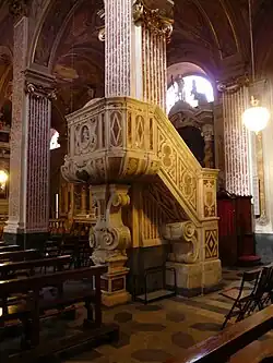 The interior has a three naves separated by square pillars with pilasters which rest on rounded arches. The interior was decorated in the 18th and 19th centuries. The nave has a barrel vault with lunettes, a deep chancel raised and a semicircular apse. The altar (1762) with polychrome marble contains a sculptural group by Francesco Maria Schiaffino depicting the Virgin Mary with cherubs holding up the Holy House of Nazareth.