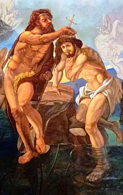 On the inner wall of the entrance from top to bottom and from right to left are frescoes created by Gino Colapietro in 1997 depicting "The Creation","The Expulsion from Eden" or " Original Sin", "God and the Tables of the Commandments" and "The Baptism in the Jordan".