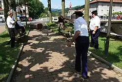 Sawing competitions, also called trontzalaritza or arpana, are seen as a variation of aizkolaritza and involve sawing through pieces of wood. The log is either fixed horizontally on sawhorses at a height of 40 cm (16 in) or at an angle with one end over the sawhorse and two members of the sawing team sitting on the lower end to stabilise the log, with two other handling the saw. The saw is usually 2 m (6 ft 7 in) long, the logs vary but can be over 1 m (3 ft 3 in) in circumference and usually between 10 and 20 in number.