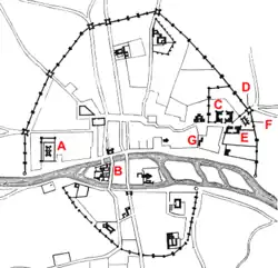 Parisian defences in 14th century: A – Louvre; B – Palais de Roi; C – Hôtel des Tournelles; D – Porte Saint-Antoine; E – Hôtel St Paul; F – the Bastille