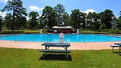 Bastrop State Park has a swimming pool that is open seasonally.[44] Guests can use the lap swim or open swim pools, and both of them are available for reservation in specific slots throughout the morning and afternoons.[45] The daily fees vary depending on the age and/or membership access.[46] The pool is equipped with a diver tower, diving boards, and wading pools on both ends. There is a bathhouse at one of the ends of the pool and lockers for pool guests.[47] The pool's construction started in December 1935 and was estimated to cost US$35,000 (about $728,214 in 2022). It was constructed along with a water filtering plant that cleaned the pool's water every eight to ten hours.[48] During the 1940s, the pool was one of the few, oval-shaped pools in Texas.[47]