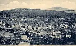 Situated at the head of navigation on the Connecticut River, and shielded from strong winds by the Green Mountains to the west and White Mountains to the east, Bath soon developed into "...one of the busiest and most prosperous villages in northern New Hampshire."[5] Intervales provided excellent alluvial soil for agriculture, and the Ammonoosuc and Wild Ammonoosuc rivers supplied water power for mills. The population reached 1,627 in 1830, when 550 sheep grazed the hillsides.[4] A vein of copper was mined. The White Mountains Railroad up the Ammonoosuc River valley opened August 1, 1853, shipping Bath's lumber, potatoes, livestock and wood pulp. By 1859, the town had two gristmills and two sawmills.[6] Other industries would include a woolen mill, creamery, distillery and two starch factories.[7]