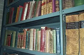 The Old Bathurst School of Arts Library Collection was probably begun soon after the establishment of the Bathurst School of Arts in 1855. In the financial year 1913–1914, the School of Arts Library Collection was measured at nearly 20,000 volumes.[5] In the 1940s at least the collection was still housed on the first floor of the 1862 School of Arts building on the corner of William and Howick Streets.[6] Bathurst City Council acquired the collection in 1956 when it took over the Old School of Arts building. The estimated 2,000 books now held in this collection were probably separated out from the Bathurst City Library's general holdings soon after acquisition, and stored together away from public access. They had never been available for lending, although they had been viewed by members of the public from time to time under supervision.[7][1]
