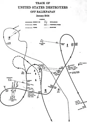 At 17:00 on the 21 January, the Japanese invasion fleet of one light cruiser, ten destroyers, four minesweepers, three submarine chasers, three patrol boats and sixteen transport ships left Tarakan for Balikpapan. A MLD Dornier spotted the fleet that same day, but heavy clouds with strong winds and prolonged rain prevented the plane from shadowing the fleet. On the next day, U.S. Navy submarines S-40, Pickerel, Porpoise, Saury, Spearfish and Sturgeon were ordered to intercept the fleet. Later, they were joined by Dutch submarines K-XIV and K-XVIII. Sturgeon fired several torpedoes on the convoy and reported sinking three ships. However, postwar records failed to confirm any damages to the convoy.[25][26][27]