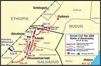 The following day, 500 Ethiopian troops and 8 tanks were reported to be heading towards Bandiradley.[19] Islamist fighters retreated from their positions. They were pursued south to the area between Galinsoor and Bandiradley, where the Islamists were defeated.[20] The ICU forces were further pursued to Adado in Galguduud, which they abandoned late on December 25, 2006.