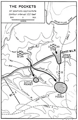 On 28 January, Hiroshi Nakanishi's 3rd Battalion, and Yorimasa Yoshioka's 20th Infantry staff, attacked I Corps' Orion-Bagac line and was able to break through into the 1st Division's rear along the Tuol River. The Japanese were separated into two pockets, a Little Pocket consisting of about one company, and a Big Pocket with 1000 men. By 5 February, Wainwright had committed five 1st Division companies, two 92nd Infantry battalions, one Scout battalion, one Constabulary battalion, plus tanks from the 192nd Tank Battalion, and artillery from the 24th Field Artillery, in an attempt to eliminate the Little and Big Pockets. On 6 February a Japanese salient formed, the Upper Pocket, when the 122nd Infantry and the 2nd Battalion, 33rd Infantry, penetrated within 800 yards of the Big Pocket. On 7 February, the 1st Division surrounded the Little Pocket, which was eliminated by 9 February. Concentrating on attacking the Big Pocket next, Trail 7 was secured by 10 February. On 11 February, Yoshioka attempted to breakout to the north, in conjunction with a general 14th Army withdrawal across Bataan. On 15 February, 377 Japanese reached their own lines, and the Upper Pocket was abandoned. With the elimination of the Japanese 20th Infantry, I Corps' line was restored on 26 February.[6]: 347–372