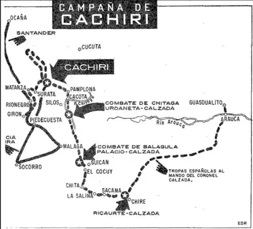 - ^ Riaño, Camilo.(1966) «La batalla de cachiri», "Revista de las Fuerzas Armadas", (37), pp. 40. doi: 10.25062/0120-0631.3107.