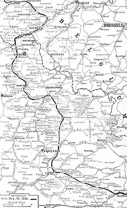 The Groupe d'Armées des Flandres (GAF) comprising twelve Belgian divisions, ten divisions of the British Second Army and six divisions of the French Sixth Army, under the command of King Albert I of Belgium, with the French General Jean Degoutte as Chief of Staff, defeated the German 4th Army in the Fifth Battle of Ypres (28 September – 2 October).[1] The breaking of the Hindenburg Line further south, led the Allies to follow a strategy of pursuing the Germans for as long as possible, before movement was stopped by the winter rains. Mud and a collapse of the supply-system, had stopped the advance in early October but by the middle of the month, the GAF was ready to resume the offensive.[2][3]
