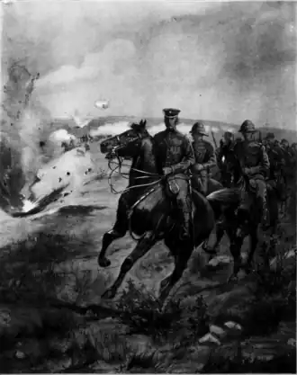While three batteries of British field guns bombarded the Boer position, and the 1st Battalion, the Devonshire Regiment advanced frontally in open order, the main attack commanded by Colonel Ian Hamilton (1st Battalion, the Manchester Regiment, 2nd Battalion, the Gordon Highlanders and the dismounted Imperial Light Horse) moved around the Boers' left flank. The sky had steadily been growing dark with thunderclouds, and as the British made their assault, the storm burst. In the poor visibility and pouring rain, the British infantry had to face a barbed wire farm fence, in which several men were entangled and shot. Nevertheless, they cut the wire or broke it down, and occupied the main part of the Boer position.[4] Sir George White rode out from Ladysmith to observe the action, but left French in command as to not interrupt on his autonomy.[5]