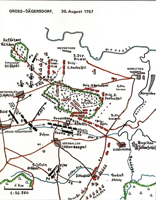 The Battle of Gross Jägersdorf (Gross-Jägersdorf; 30 August 1757) was a victory for the Russian force under Field Marshal Stepan Fyodorovich Apraksin over a smaller Prussian force commanded by Field Marshal Hans von Lehwaldt, during the Seven Years' War. This was the first battle in which Russia engaged during the Seven Years' War.