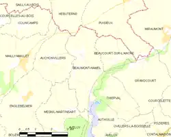 ![]() Modern map of the municipality Beaumont-Hamel. Serre is on the Mailly-Maillet–Puisieux road. | |||||||