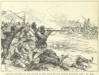 ![]() The British troops (right) attack the Afghan line (illustration from a British book) | |||||||