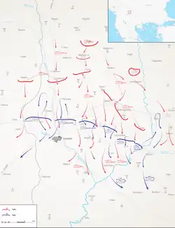 On the left Ottoman wing, a lot of reservists from Üsküb Infantry Division had deserted during the night, upon hearing that the Third Army had captured Pristina and that it was marching towards Skopje.[19] Still, at 5:30, VII Corps started the attack. However, Morava Division I counterattacked at 6:00 and with the arrival of Timok Division II from the rear they forced the entire Ottoman left wing to retreat.[20]