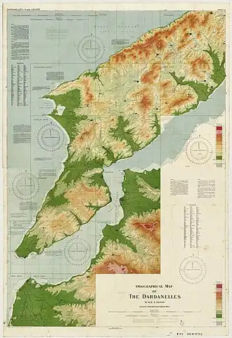 ![]() Kum Kale at bottom left: Orographical map of the Dardanelles reduced from captured Ottoman maps | |||||||