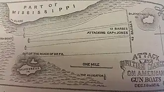 At night on December 12, the British rowboats, under Lockyer, set off to enter Lake Borgne, to attack the gunboat squadron.[13] Jones sighted the British rowboats on December 13 at 10:00am believing them to be disembarking troops, advancing in the direction of Pass Christian and then stopping. When he saw their route at 2:00pm, advancing past Pass Christian without stopping, he realized they were heading to attack his gunboats.[13][24] The shallow waters caused Jones issues, three of his gunboats being in 12 or 18 inches of water less than their draught, which was resolved by the flood tide at 3:30pm.[13][25]