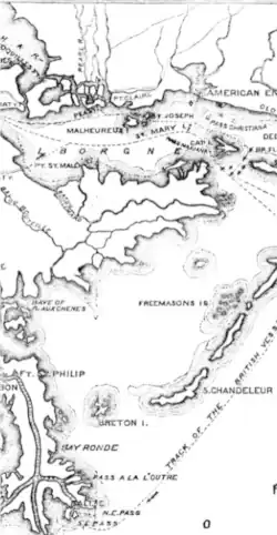 Jones's squadron headed back in the direction of the Rigolets, mooring at Bay St Louis on December 10. The following day, they prepared their boats to make an attack. On December 12 the squadron arrived at Cat Island, but found the overwhelming strength of the British would have been disadvantageous to the gunboats, so they returned in the direction of the Rigolets, and the fort at Petit Coquilles.[21] Owing to the strong current, they were only able to get as far as the channel between the mainland and Malheureux Island on December 13 (to the south of the modern day settlement of Ansley, Mississippi).[22] Jones had been ordered by Patterson to position his gunboats across Pass Christiana, then at the mouth of Lake Borgne, then fall back to the Rigolets to make a stand.[23][17]