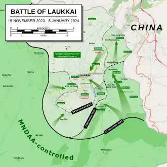 The Battle of Laukkai was a military offensive conducted by the Myanmar National Democratic Alliance Army (MNDAA) encircling and capturing Laukkai, the capital of the Kokang Self-Administered Zone (Kokang SAZ) in northeastern Myanmar. The battle was part of the larger Operation 1027, a joint military operation conducted by the Three Brotherhood Alliance coalition of three ethnic armed organisations and part of the overall renewed civil war in Myanmar.[5]