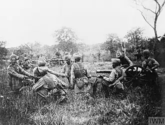 A force of three battalions of Nigerians was sent against Wahle's troops at Nyangao and engaged him there on the 15th.[3] Von Lettow-Vorbeck brought up reinforcements to Wahle and pitted his additional four companies against them. The Nigerians were soon threatened with encirclement and suffered severe casualties. A larger force had been sent by the British to attack the Germans from the opposite side, but this was also met with stubborn resistance when the Germans withdrew from Nyangao on the 16th and dug in on the ridge at Mahiwa 2 miles (3.2 km) from their previous position.[3] Despite the attacks from the newly arrived British force, the Germans were able to hold their ground and counter-attacked on the 17th and 18th forcing the British to withdraw with heavy casualties.[4]