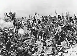 The 3rd Division came at the head of Thomières's division in a two-deep line. Despite its deployment in column formation, the French division initially repulsed its attackers, but was then routed by a bayonet charge. Thomières was killed. Seeing British cavalry in the area, Maucune formed his division into squares, the standard formation to receive a mounted attack, but a poor choice when defending against infantry. With their two-deep line, Leith's 5th Division easily defeated Maucune in a musketry duel. As the French foot soldiers fell back, Cotton ordered John Le Marchant's heavy brigade (5th Dragoon Guards, 3rd and 4th dragoons) to attack them. The left wing of the French army was on the point of being defeated by the 3rd and 5th divisions of Anglo-Portuguese infantry when Le Marchant's dragoons charged in and destroyed battalion after battalion with the heavy cavalrymen's weapon, the sword, an exercise which had been designed by Le Marchant. Many of the French infantrymen sought the protection of the British infantry to escape the sabres of the dragoons. Le Marchant, knowing he had achieved a magnificent success having crushed eight French battalions, was leading a squadron when he was shot in the spine and killed.[13] William Ponsonby succeeded to command of the brigade.