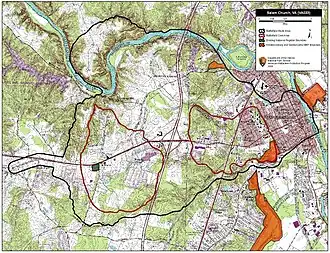 By 11 a.m. on May 4 General Sedgwick was facing three directions; west towards Lee's main body and the Salem Church, south towards Anderson's division, and East towards Early's division. When General Sedgwick heard rumors that reinforcements from Richmond had arrived he felt his situation was becoming more difficult. He already had a six mile long line held by 20,000 troops against now 25,000 Confederates with only a bridgehead to retreat upon in failure, with more Confederates possibly arriving and himself with over 5,000 casualties he was concerned. He reported his difficult situation to General Hooker and requested the main army assist him. General Hooker, however, replied not to attack unless the main army did the same.[8] Meanwhile, General Lee arrived at McLaws' headquarters at 11 a.m. and McLaws informed him that he did not feel strong enough to launch an attack and asked for reinforcements. Anderson was ordered to bring the other three brigades of his division and position them between McLaws and Early; he then launched additional attacks, which were also defeated.[9]