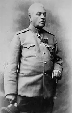 Under these circumstances, by the order of Armenian Corps commander Tovmas Nazarbekian and Chief of Staff of the Corps Evgeny Vyshinsky, the Armenian forces were regrouped and rearranged in order to stop Ottoman attacks in separate areas, particularly in Alexandropol-Sardarapat and Karakilisa.[31] According to an instruction received from the General Staff on 19 May, Major-General Movses Silikyan decided to concentrate the troops he had at his disposal in Etchmiadzin and avert the Turks' attack on Yerevan through a counter-attack.[32] On 20 May, the Armenian vanguard was forced to abandon Araks and Karaburun stations, retire from the foothills of Mastara, Talin and Ashnak, basing themselves in Sardarapat. In the evening of 20 May, the retreating troops of the 1st Special Brigade – the Erzinjan Regiment and half a battalion from the Khnus Regiment (under the command of Karapet Hassan-Pashaian) – moved deeper from Sardarapat to the village of Khznauz.[33]