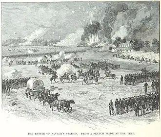 The Battle of Savage's Station took place on June 29, 1862, in Henrico County, Virginia, as the fourth of the Seven Days Battles (Peninsula Campaign) of the American Civil War. The main body of the Union Army of the Potomac began a general withdrawal toward the James River. Confederate Brig. Gen. John B. Magruder pursued along the railroad and the Williamsburg Road and struck Maj. Gen. Edwin Vose Sumner's II Corps (the Union rearguard) with three brigades near Savage's Station, while Maj. Gen. Thomas J. "Stonewall" Jackson's divisions were stalled north of the Chickahominy River. Union forces continued to withdraw across White Oak Swamp, abandoning supplies and more than 2,500 wounded soldiers in a field hospital.