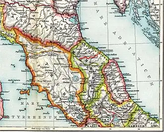 In 295 BC the Romans won the Battle of Sentinum against the Etruscans and their Gallic allies, gaining the upper hand over the Gauls; a victory of the Senones over a Roman army at Arretium in 284 BC failed to alter the new balance of power.[13] Roman victory at Lake Vadimo in 283 BC, against an army made up of Senones, Boii and Etruscans, led to the destruction of the Senones as an independent power with their subsequent expulsion from their lands, which were reorganized by the Romans as the Ager Gallicus, centered upon the Latin Rights colony of Sena Gallica.[3][13] Romans and Gauls lived in peace for the next 47 years until hostilities broke out with the Boii, who had settled around the Etruscan city of Felsina.[14]