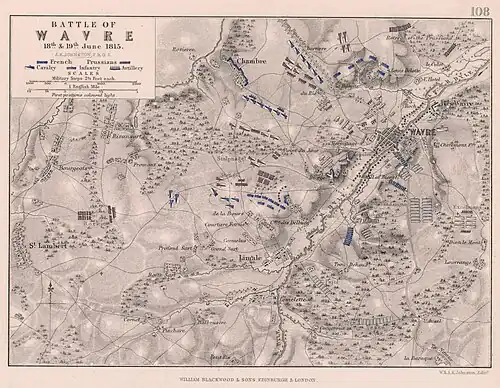 That suburb of the town of Wavre which lies on the right (i.e., the south) bank was occupied by light troops only. The great bridge was barricaded as well as time and circumstances would admit. The houses adjoining the left bank of the river were hastily loopholed. The smaller bridge was left perfectly open. A detachment of two companies of light infantry, under Major Bornstadt was detached to reinforce the troops at the bridge at Basse-Wavre.[15]