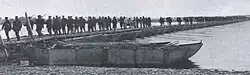 Japanese engineers determined that ten bridges 1,630 yards (1490.5m) would be required to span the river. A third of these were steel prefabricated pontoons which weighed 100 pounds each.[4] The remainder were made from local resources. In full view of Russian positions, the Japanese began constructing a causeway across the Yalu River to Kintei Island with the intention of distracting and exposing enemy artillery fire. The ruse worked as the bridge was immediately targeted by two Russian batteries. With the Russians so engaged, the Japanese prepared ten other bridges that could quickly be moved into position for a rapid assault across the river at other locations.