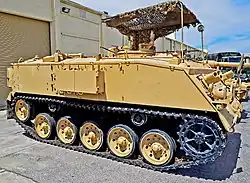 Using a Humvee, Battlefield Vegas transports visitors from their Las Vegas Strip hotels to the complex.[4][18] It teaches visitors about the military history of the United States through exhibits, including a World War II tent set in North Africa, a Willys Jeep made in 1944, a Bell UH-1 Iroquois helicopter used during the Vietnam War, and eight M35 series 2½-ton 6×6 cargo trucks.[2] The complex has a yard that the employees have christened "Petting Zoo", featuring numerous decommissioned military conveyances, particularly tanks.[19][20] Penn Jillette rented a T-90 tank from the company in 2016 to demolish "The Slammer", the southwest Las Vegas house he purchased in 1994, for his independent film The Grounds.[21] Battlefield Vegas has an assortment of machine guns of the same type that had been used by nearly all member states of NATO and in past wars including World War I, the War in Afghanistan, and the Iraq War.[2] Seeded from co-founder Ron Cheney's private selection, the weapons number roughly 750.[4][5] 550 of them are automatic firearms.[5] Some of the firearms are privately made while some are fixed up.[4]