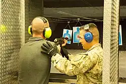 Housing an indoor shooting range with 11 lanes,[4][5] Battlefield Vegas is the largest Las Vegas indoor gun range.[22] Customers aim at targets placed 25 yards (23 m) away.[23] The company has a 25-acre desert area where visitors can do outdoor shooting.[23] Prior to using the firearms, customers are informed about the regulations and must complete a waiver form.[4] To get into the shooting range, they enter a pair of soundproof doors.[5] When using the range, customers put on earmuffs for hearing protection and goggles for eye protection.[4] They are accompanied by a range safety officer.[2][4] After completing their shooting, visitors can keep what they shot as mementos.[4]