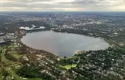Before human settlement, Bde Maka Ska and the Chain of Lakes were mostly surrounded by bogs and marshes that slowly grew in the depressions left behind by glacial movement.[9] Between 1911 and 1924, Bde Maka Ska was dredged and these wetlands were filled in. Since human settlement, the water quality of Bde Maka Ska and the Chain of Lakes has declined.[10] The Chain of Lakes watershed was polluted by 19th-century agricultural development and 20th-century storm sewer drainage systems. This increased phosphorus concentrations in the lake, leading to eutrophication. In 1990, restoration efforts in the Chain of Lakes watershed began due to public pressure over poor water quality.[11] Over the next decade, public awareness campaigns about stormwater runoff, regulations for phosphorus in fertilizer, and targeted sediment management improved the Chain of Lakes' water quality. Bde Maka Ska showed the largest improvement, reaching phosphorus levels only slightly above pre-settlement conditions.[12]