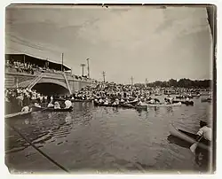 Even before the lake was dredged, the lake was commonly used for sports and recreation. By the late 1870s, boating clubs regularly hosted regattas on it.[38] Sailing, a common activity on Bde Maka Ska today, was formally organized as early as 1901 by what was then called the Calhoun Yacht Club.[39]
