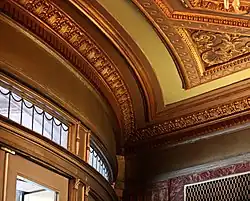 East of the vestibule is a circular rotunda with Rococo-inspired decorations. The rotunda ceiling is as high as the auditorium itself; it contains moldings of rosettes and coffers, as well as a large chandelier hanging from its center.[12][17] The western wall of the rotunda, which leads from the entrance vestibule, contains fluted pilasters on either side. Above the doorways is a landscape mural by Valdemar Kjoldgaard.[12][18] Some time before a renovation in 2008, the mural had been covered with wallpaper, though the artwork was restored during the renovation.[8] On the eastern wall of the rotunda is a passageway flanked by Ionic-style pilasters, which reach from the floor to the ceiling. Above the passageway is a decorative panel, as well as an archway with full-height colonettes on the mezzanine and balcony levels.[12][17]