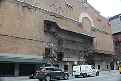 The facade of the auditorium faces 75th Street and Amsterdam Avenue, where the first floor is made of stone and the upper stories are made of brick. Both facades have blind openings without any windows. There are horizontal band courses above the first and fifth floors, corresponding to those on the hotel's facade, as well as an arcade near the auditorium's roof. On 75th Street, there is a large arch at the center of the facade, with a stone frame, along with three blind arches on the fifth-story band course above it. On Amsterdam Avenue, there is a large stone-framed ogee arch at the fifth story, along with four blind arches to the sides. A stepped gable rises atop the auditorium's Amsterdam Avenue facade.[3]