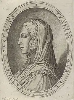 According to many accounts, Beatrice appears as an intelligent woman who concerned herself in the current affairs of state. Her reputation for honesty and modesty made her a martyr in the eyes of many. Her story inspired many writers. A book written by Carlo Tedaldi-Fores[14] inspired Vincenzo Bellini to write a two-act opera, Beatrice di Tenda, first performed on 16 March 1833 at the La Fenice in Venice. Sarah Josepha Hale included a laudatory article about her in her encyclopedic Woman's record; or, Sketches of all distinguished women from the creation to A.D. 1854.[1] She also appears as a minor character in Bellarion[15] by Raphael Sabatini.