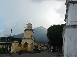 Meanwhile, torrential rains combined with an earthquake led to the collapse of the crater wall of the Volcán de Agua in the early hours of 11 September. Floodwaters from the former crater lake rushed downhill along what had been a deep arroyo toward the colonial capital of Santiago de los Caballeros de Guatemala (Ciudad Vieja) in the valley below (Almolonga), carving a huge scar down the mountainside.[9]