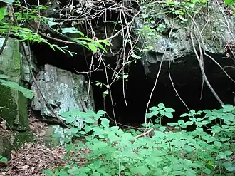 Up until the mid-twentieth century and despite ample historical evidence that Delaware Indians used it for shelter, the National Speleological Society maintained that Delaware was the only state in the union lacking a cave.[2] In 1958, a local resident, George Jackson, added this cave to the national cave files.[3] The cave was the focus of research in the 1940s when the Archeological Society of Delaware conducted a dig which revealed conclusively that native tribes (including Lenni Lenape) had used it for shelter and storage.[2] Sitting just 100 feet from the Pennsylvania border this small cave extends just 56 feet to its furthest reach, but has become one of the most researched caves in the United States relative to its size. Jack Speece notes that the cave has gone by many names in its history. Indian Cave, Beaver Valley Rock Shelter, and Wolf Rock Cave preceded the now more commonly accepted "Beaver Valley Cave".[2]